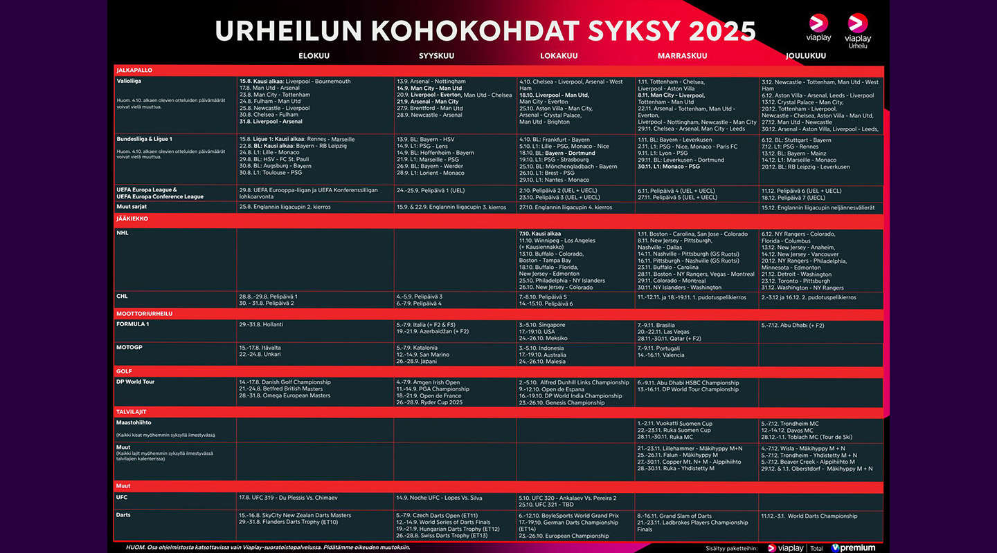 Viaplayn kanavilla riitttää elo–joulukuussa katsottavaa. Ota parhaimmat tapahtumat talteen oheisesta kalenterista ja seuraa mukana kanavilla!