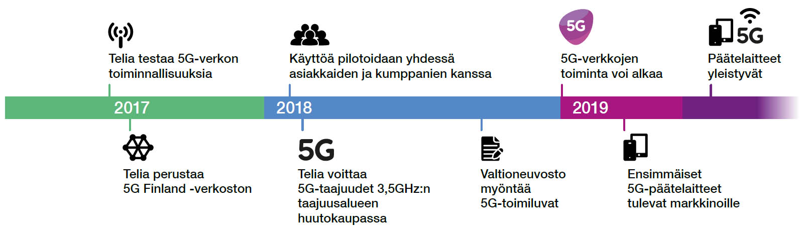 Laitevalmistajat toivat ensimmäisiä kuluttajien 5G-laitteita markkinoille vuoden 2019 aikana. Ensimmäiset laitteet olivat reitittimiä ja tabletteja, joita seurasivat myöhemmin puhelimet. Nyt 5G-laitteita on laajasti saatavilla ja 5G-verkko löytyy jo lukuisista Suomen kaupungeista.